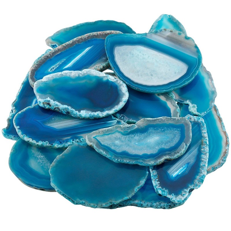 - Set of 10 undrilled agate slices.Length:1.2-3 inch;Width:0.78-2 inch;thickness:0.2 inch.Artificially color enhanced Blue agate slices to provides a stylish,outstanding appearance.