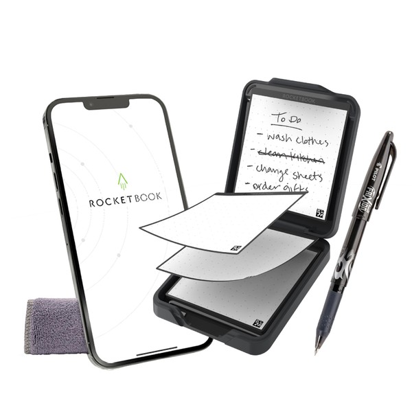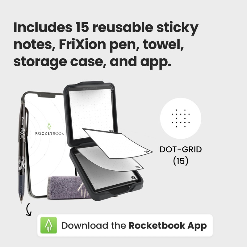 Rocketbook Rocketbook Reusable Sticky Notes Starter Pack with Storage Case, Pen, and Towel, 3"x3", 15 Black Notes - Dotted Paper, App-Connected, Erasable, Reusable Adhesive, Ideal for to-Do Lists