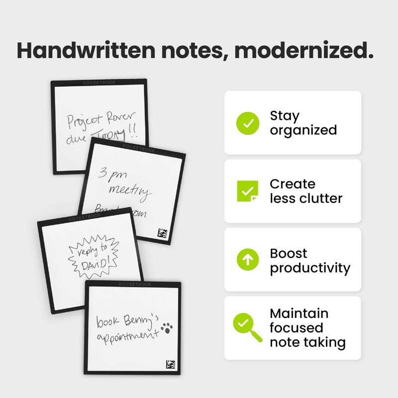 - Reusable and Clutter-Free: Reduce waste and keep your space tidy with restickable sticky notes that offer a paper-like experience. They stick securely to many surfaces, like monitors, whiteboards, desks, and even your Rocketbook notebook.