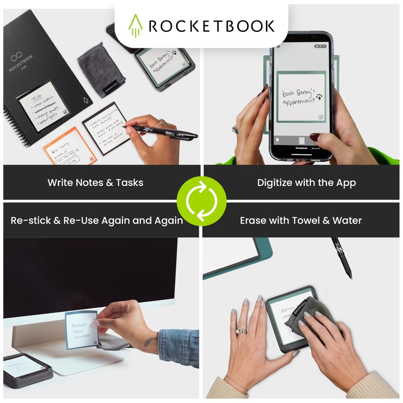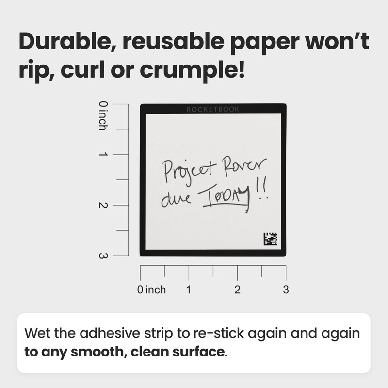 - Write, Scan, Erase, and Re-Stick: Write notes with a FriXion pen, scan multiple notes at once with the Rocketbook app to save digitally, wipe clean with a towel and water, then wash the reusable adhesive to re-stick again and again as needed.