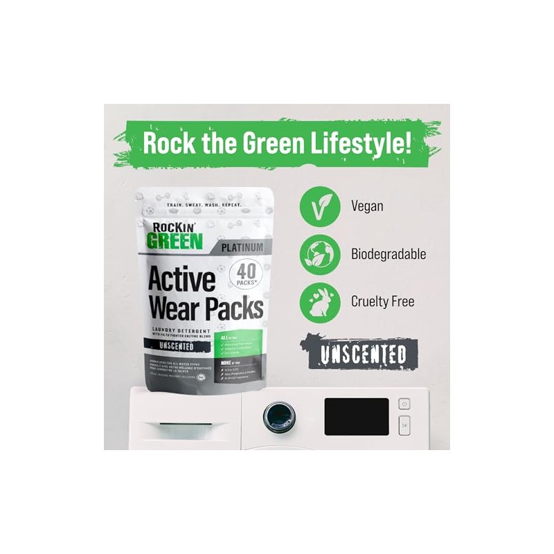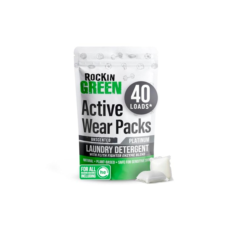 Rockin' Green Cápsulas de detergente para ropa, a base de plantas, totalmente naturales, veganas y biodegradables, combatientes de olores, seguras para pieles sensibles (sin perfume, uso activo, 40