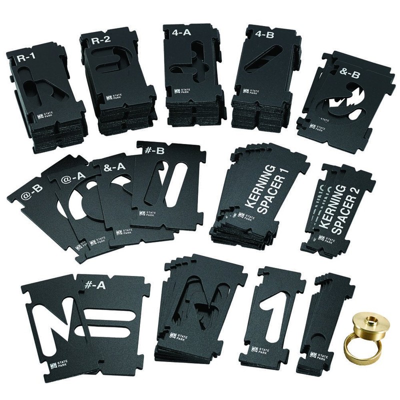 Rockler Woodworking Router Sign Making Kit: Produce classic wood signs with our instantly recognizable ''State Park'' font wood sign making router kit. Our letter router sign maker templates feature adjustable kerning for the most natural-looking layout of your text, with neat, even spacing between all letters. With our router templates for woodworking clever 2-stage system, you get neat, whole letters, with no seams. There is no need to split letters such as A, B, and D, as a way of securing the ''eye'' in the middle. Our router sign kit requires a 3/8'' Signmaker's Carbide Router Bit (sold separately) & recommended for use with plunge router with perforated base. --- What’s Included In Our Router Templates Kits: (99) Individual Templates (letters, numbers, symbols, and kerning spacers) - (1) Brass Guide Bushing - (1) Set of Instructions --- Interlock Signmaker's Number Template Kits Tech Specifications: Weight: 5.130000 - Included Letters are for Capitals Only - Template Thickness: 3/32'' - Included Letters: A, A, B, C, D, E, E, F, G, H, I, I, J, K, L, L, M, M, N, N, O, O, P, P, Q, R, R, S, S, T, T, U, V, W, X, Y, Z - Included Numbers: 1, 1, 2, 2, 3, 3, 4, 4, 5, 5, 6, 6, 7, 7, 8, 8, 9, 9, 0, 0 - Included Symbols: !, @, #, $, ', ?, ., /, &
