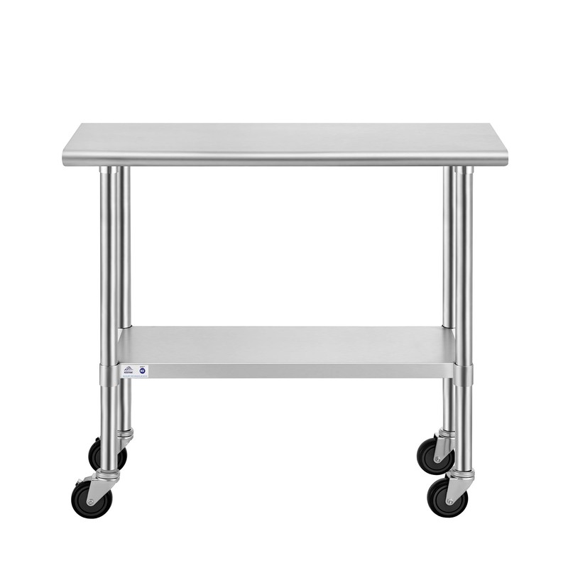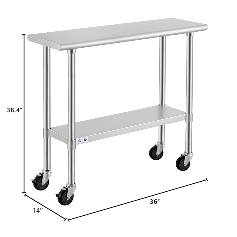 - Tall heavy-duty table for food prep and storage; ideal for a kitchen, bar, restaurant, school, or other commercial space