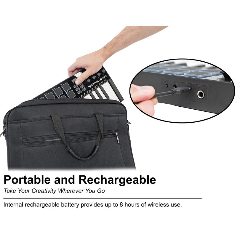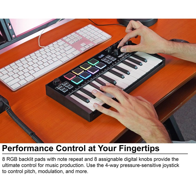 • PORTABLE 25-KEY MIDI CONTROLLER: The Rockville M25 features 25 full-size velocity-sensitive keys that provide a comfortable feel, making it ideal for studio work, live performances, or music production on the go. Its compact design ensures it fits easily into any setup.