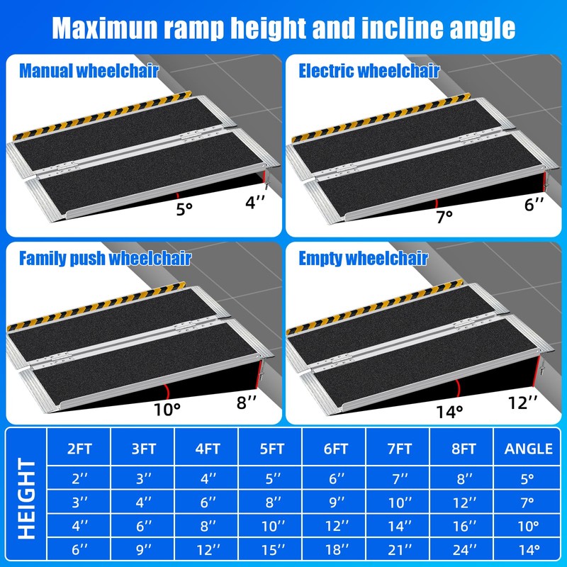 - 【Perfect Fit for 4"-12" Steps】Designed specifically for step heights of 4" to 12", this 4ft wheelchair ramp ensures a seamless transition. Supports up to 800 lbs—please do not exceed the maximum weight capacity. (Note: Slight sinking during use is normal and will quickly rebound.) Always check the buyer’s guide to select the correct size before purchasing.
