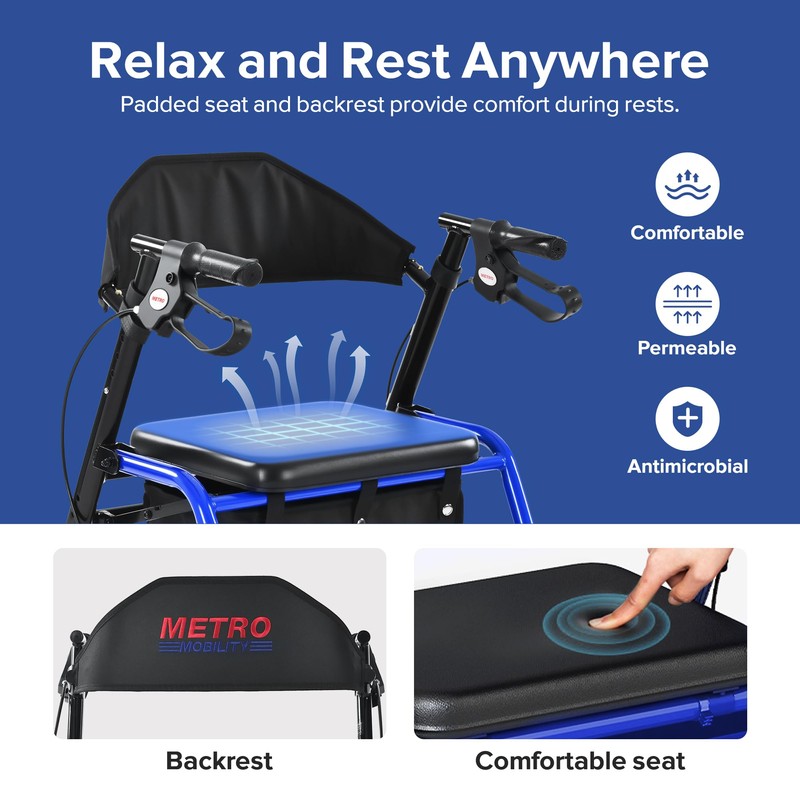 Rollator Walker for Seniors, 300lbs Capacity, Foldable Lightweight w/Padded Flip - up Seat, 8” PVC Wheels, Iron - Aluminum Frame, Detachable Storage, Blue