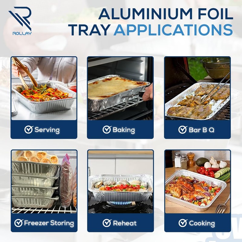 - Multipurpose: These foil baking trays are perfect for a wide range of applications, including baking cakes, cooking, broiling, and roasting. Whether you need foil trays for baking, foil trays for turkey, or foil trays for BBQ, these sturdy containers are up to the task. These BBQ trays are especially suitable for cooking bulk meals and packing leftovers for your guests.