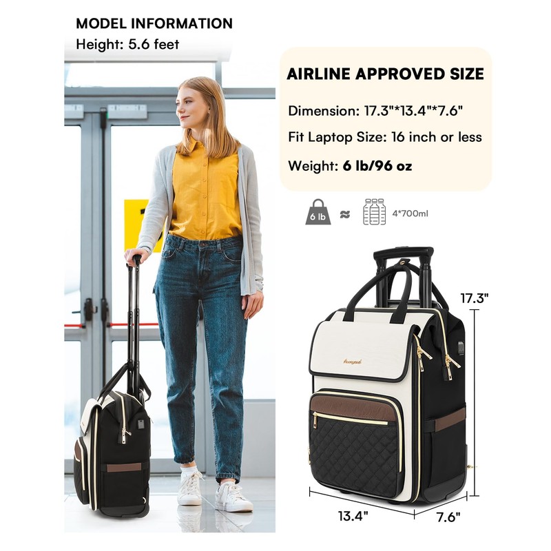 - TSA-Friendly & Multi-Purpose: This rolling backpack carry-on luggage is perfect for college, business trips. Designed to meet most airlines' personal item size requirements, it's compact 17.3" x 13.4" x 7.6" inches dimension and 6lb weight fit in most airline's overhead compartments and underseat size. 180° opening allows for quick and hassle-free security checks. The versatile design makes it an ideal weekend getaway bag and a reliable travel companion or rolling teacher bag with wheels.