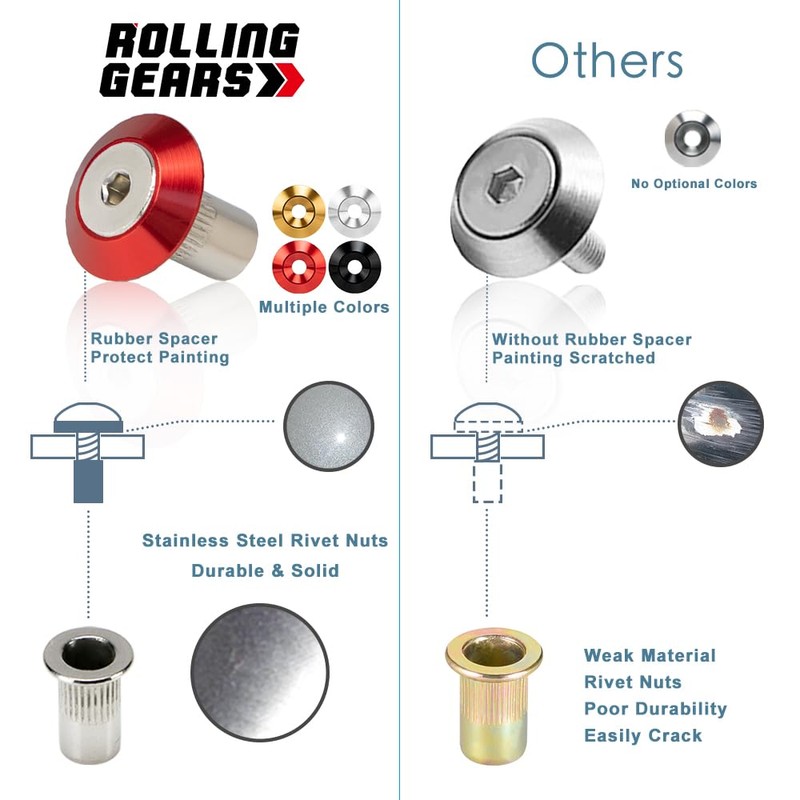 - Durable and Vibration-Resistant: Rubber spacers prevent metal-on-metal contact and minimize vibrations for added security; bolts and rivet nuts are made of stainless steel for excellent durability and rust protection.