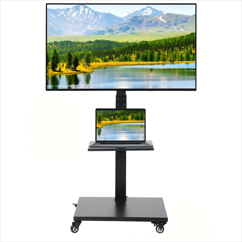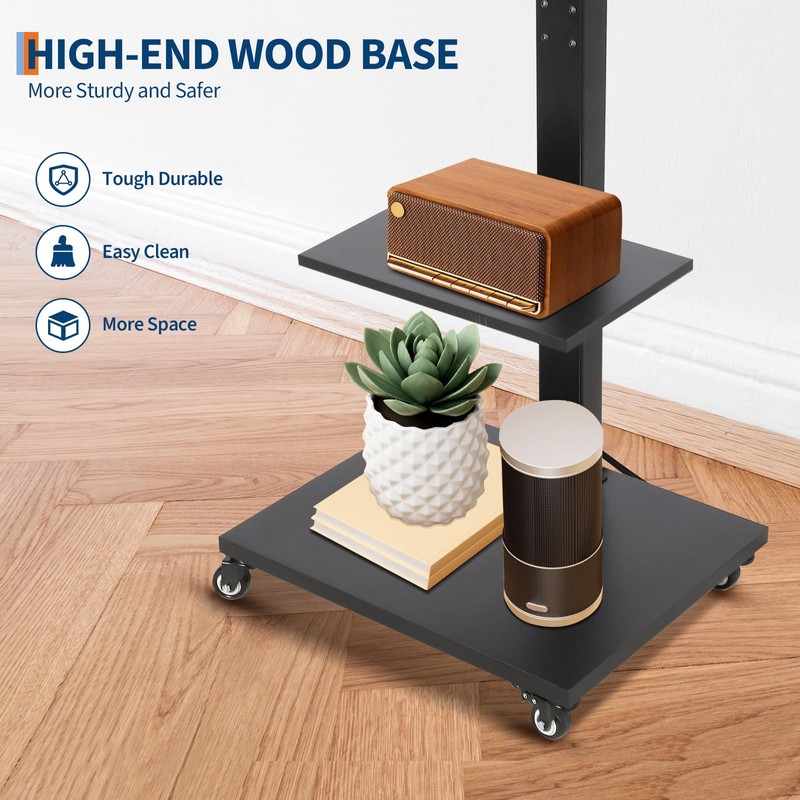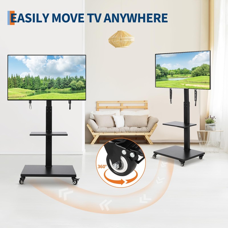 - Dynamic Mobility & Ergonomic Adjustments: Four noise-canceling 360° swivel casters enable effortless movement across hardwood, tile, or carpeted surfaces. Adjustable height (±8° tilt) and 60° rotational versatility allow precise alignment for optimal viewing angles, whether in bedrooms, offices, or outdoor spaces.