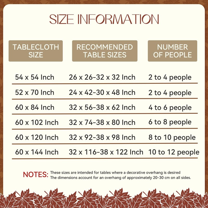 - FITS MOST TABLES: Measuring 54 x 54, our tablecloth is perfect for tables that seat 2-4 people. Whether you're hosting a Thanksgiving dinner party or enjoying a meal with family, this tablecloth is a good choice.