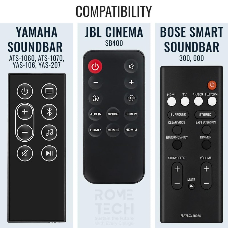 - Rome Tech CR2025 battery compatible with Bose Smart Soundbar 600/300, FSR78 ZV28960 for Yamaha Soundbar ATS-1060 ATS-1070 YAS-106 YAS-207 YAS-107 YAS-108 YAS-207BL YAS-CU207 Home Audio Speaker Bluetooth Soundbar, Remote Control for JBL Cinema SB400 93040000860 SB4OO, CINEMASB400. Please make sure you need battery CR2025