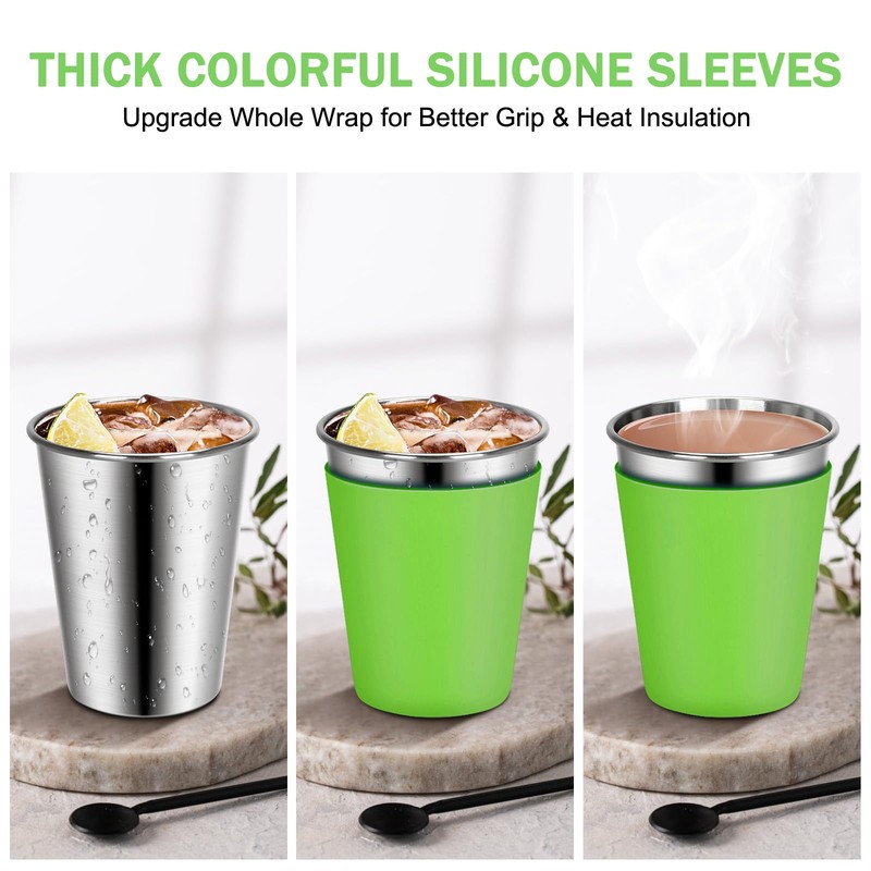 12oz cups are perfect size for little hands to hold and the slip-proof silicone sleeve protecting your kids’ hands from very cold or hot beverage and also different color can help everyone easily identify which cup belongs to them that can be especially useful when guests or households with multiple people.