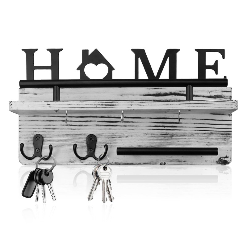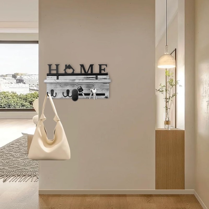 This decorative wall mounted key holder can hold letters, key rings, wallet, dog leash and other commonly used personal items.
