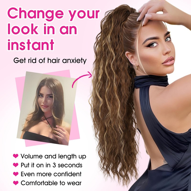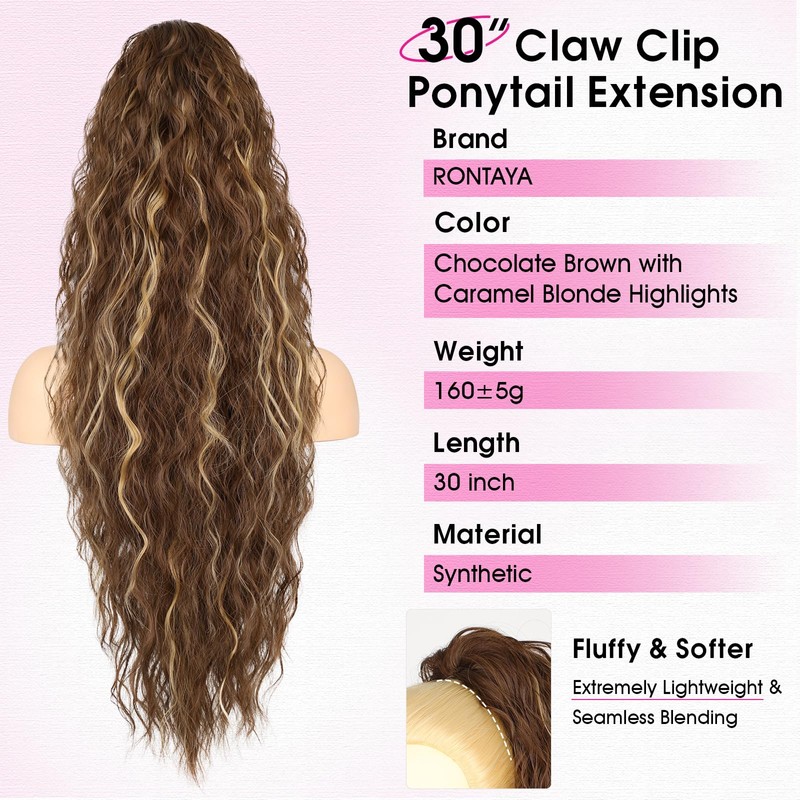 RONTAYA Ponytail Extension, 30 Inch Highlights Claw Clip Ponytail Extensions for Women, Multi Layered Fluffy Thick Curly Wavy Jaw Clip in Fake Pony Tails Fake Hair Soft Wave Synthetic Hairpiece
