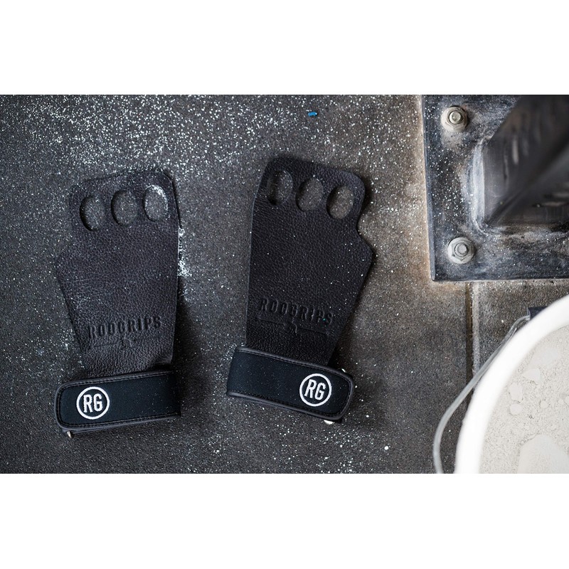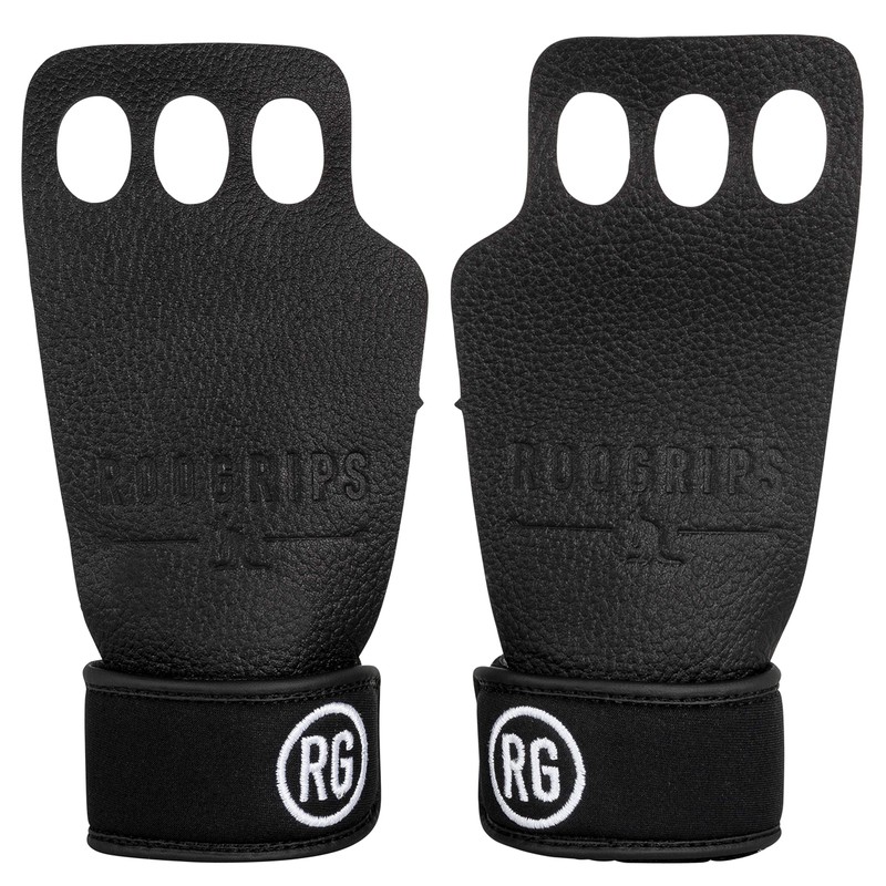 RooGrips - 3-Finger Durable Protective Leather Hand Grips, Weightlifting and Gymnastics Grips, Non-Slip Pull Up Gloves for Men and Women, Black, Small