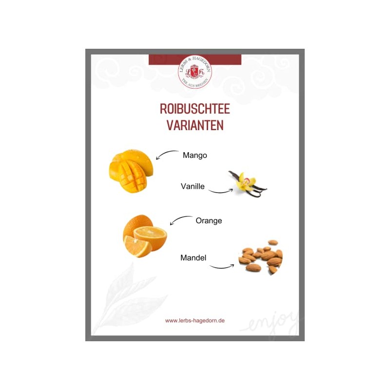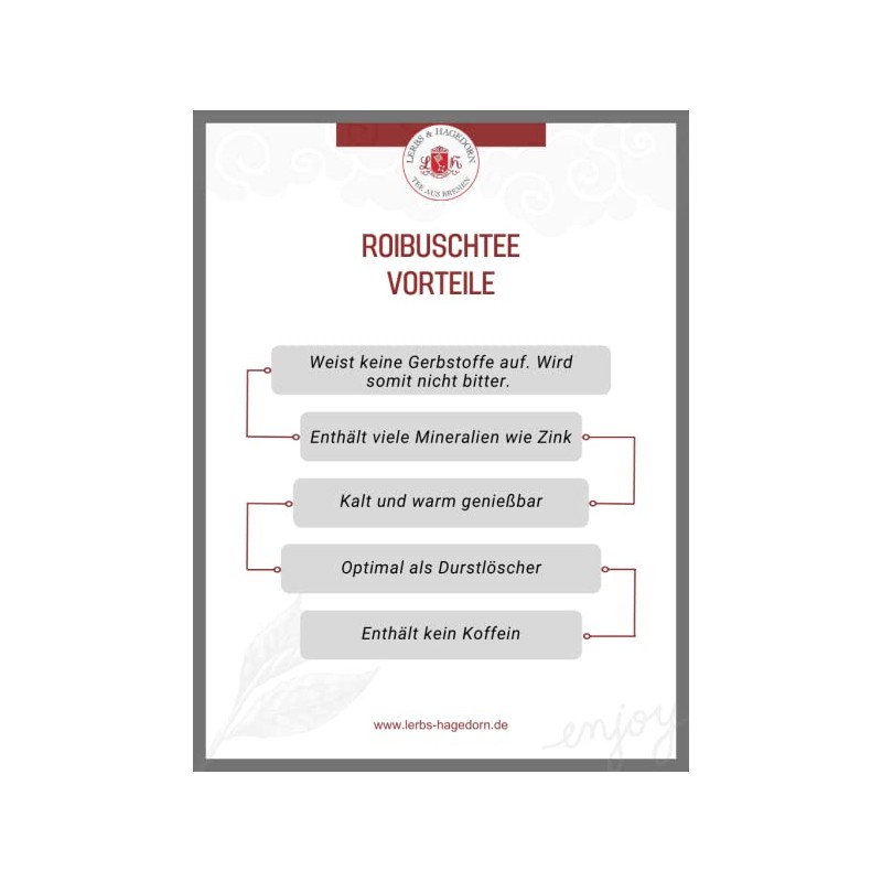The Rooibusch tea red groats impresses with a sweet aroma of cherries and strawberries. In addition, rose petals are added to the loose tea, so that a beautiful picture results. It is a pleasure to brew this tea. It develops a beautiful reddish-brown cup colour and smells wonderfully fruity. The aromatic tea is a pleasure. With its strawberry and cherry aromas, it is reminiscent of red groats. And so it tastes excellent when some cream or milk is added. The Rooibusch tea is also a pleasure when cooled and drunk as iced tea.