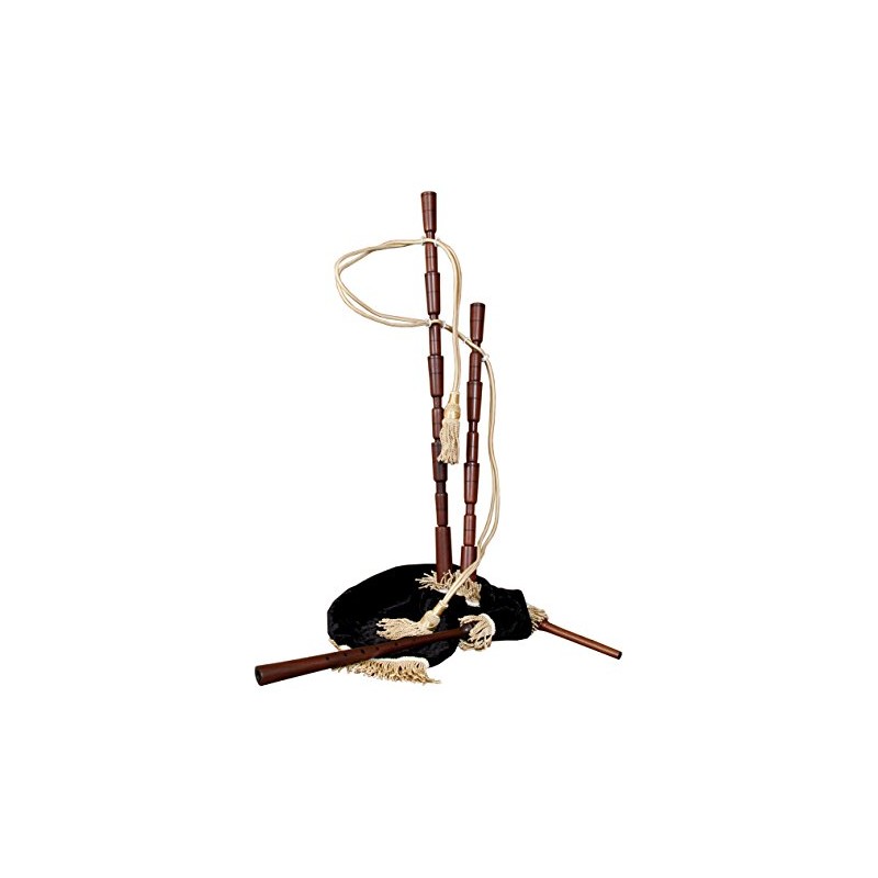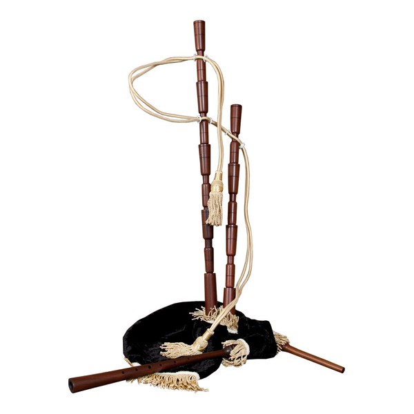 This 2 drone sheesham bagpipe with no mounts, a narrow bell on the chanter, a black velvet cover and Rexine bag. Played in the key of "F". This Roosebeck Bagpipe set has a Rexine bag. Rexine is a soft, synthetic, material designed to be air tight and to feel like high quality suede. The Rexine bag features a contoured goose neck for better airflow. Unlike the natural leather bag, the Rexine bag requires no breaking in period, and no seasoning. We think all pipers will appreciate the design, the texture and the lighter weight of this set with its Rexine bag. Includes 2 cane chanter reeds and 2 sets of cane drone reeds. Approximately 35" x 20" x 5".