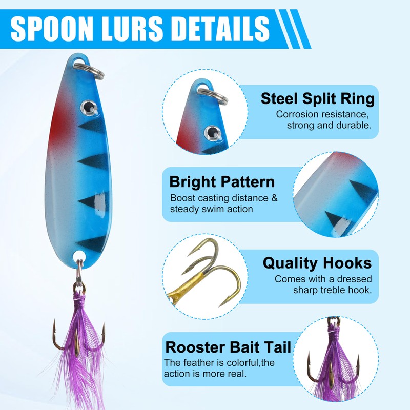 - LIFELIKE MOVEMENT: These Spoon fishing lures can provide continuous flash and vibration,with the lifelike movement of a rooster tail,that provokes big fish to bite.Really good spin action that's what makes a great fish catcher.
