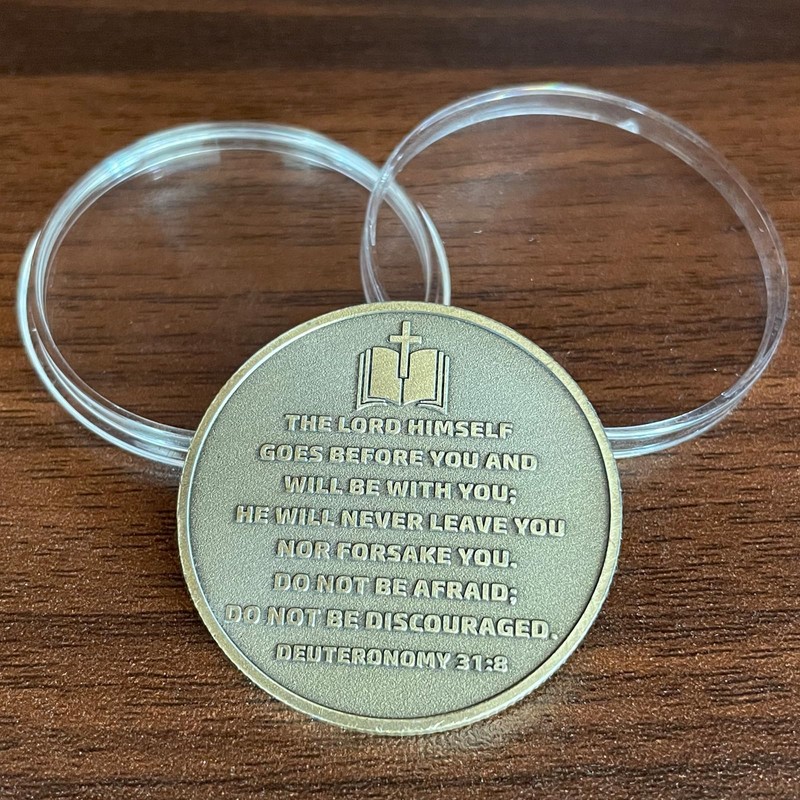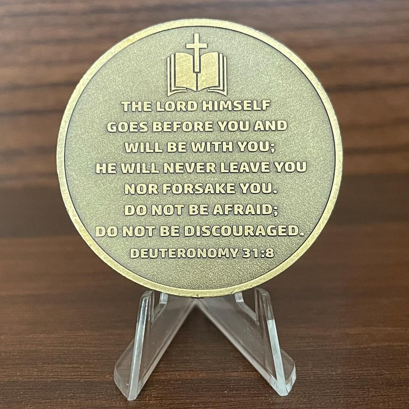 - You'll find an inspiring scripture engraved: "The Lord himself goes before you and will be with you; He will never leave you nor forsake you. Do not be afraid; do not be discouraged." Taken from Deuteronomy 31:8, this verse provides comfort and courage during challenging times