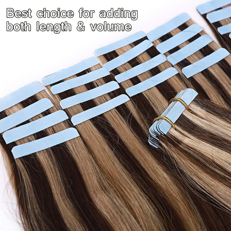 - Texture: silky straight. Length: 18 inch. Color: Medium Brown Mixed Dark Blonde #4&27. Double sided tapes (0.31*1.57").