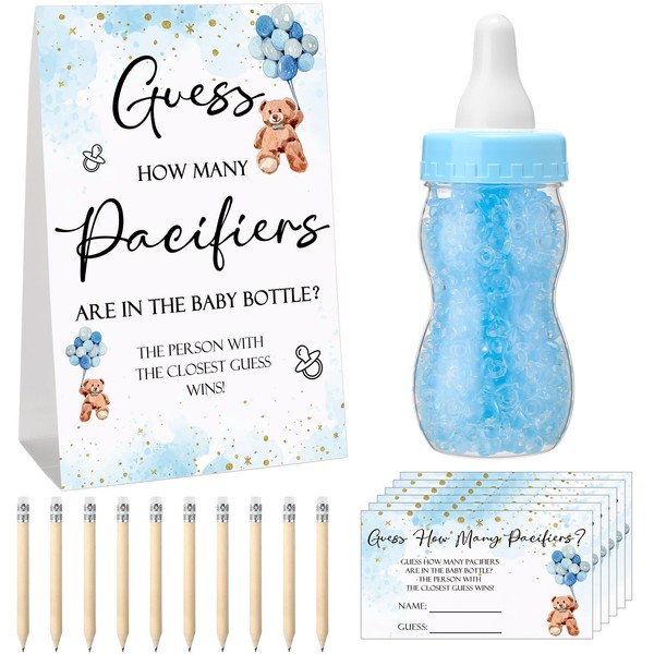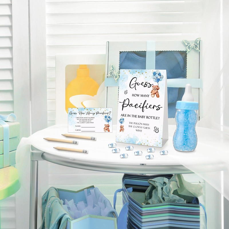 Roowest 512 Pcs Baby Shower Games Guess How Many Pacifiers Sign 100 Small Guessing Games 10 HB Pencils 750ml Milk Bottle 400 Acrylic Pacifiers Decoration for Guest Gender Reveal(Blue,Bear)