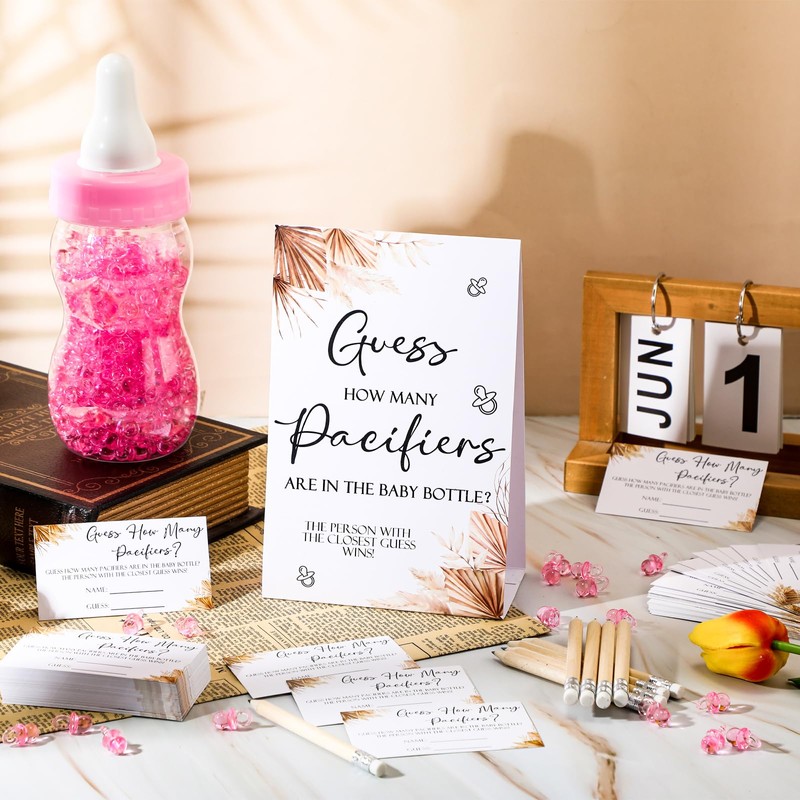Roowest 512 Pcs Baby Shower Games Guess How Many Pacifiers Sign 100 Small Guessing Games 10 HB Pencils 750ml Milk Bottle 400 Acrylic Pacifiers Decoration for Guest Gender Reveal(Pink,Boho)