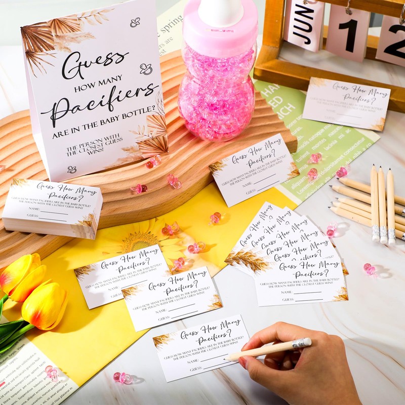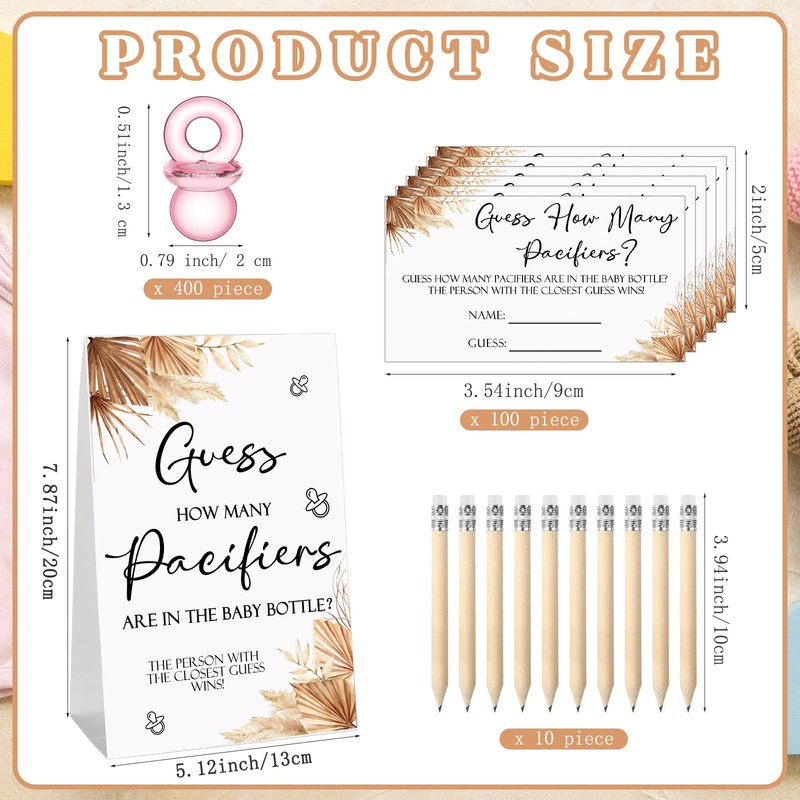 • Boho Cards Set: you will get 1 piece of Guess How Many Pacifiers game sign, 100 pieces of small cards, 10 piece of HB pencils, 1 piece of milk bottle in 750 ml, and 400 pieces of mini baby pacifiers, which can meet your various demands and bring you a nice playing experience, also ideal for sharing with others