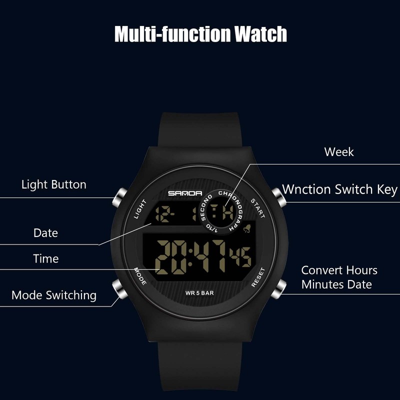 - ►【Multifunctional Digital Watch】This digital watch has time, date, week, alarm, stopwatch, hour beat, 12/24h format, shockproof, original Japanese battery, waterproof these functions. The functions make it perfect for all types of sports and daily use. It can be used not only for all types of sports, but also in everyday leisure and business occasions.