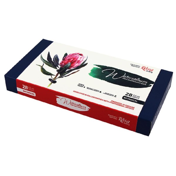 ROSA Gallery Fine Art watercolours are made with organic gum arabic, finely ground premium organic and inorganic pigments. The special feature is the development of pink paints in collaboration with professional artists. At the initial stage, the main characteristics of the paints are defined, such as the colour palette, transparency and intensity of each colour, the texture of the paint and the ease of brushing. Then different paint samples undergo expert evaluation and testing. Then, taking into account the observations and preferences of the artists, the colour is refined to begin its mass production. ROSA Gallery Fine Art Watercolour Paints are designed and produced in Ukraine. High-quality materials, professional approach and modern specialized equipment ensure the highest quality of products. Organic and inorganic pigments Organic shellac High light fastness High pigment concentration Bright and bright colours Easy dilution and brushing properties The blue metal package contains 28 colours of 2 ml: 704 - Titanium White, 702 - Cadmium Lemon, 731 - Cadmium Yellow Light, 732 - Cadmium Yellow Deep, 705 - Cadmium Yellow Deep, 705 - Cadmium 734 - Flame Red, 706 - Cadmium Red Light, 740 - Bright Red, 725 - Madder Red, 726 - Madder Rose, 744 - Opera Rose, 709 - Magenta Rose, 749 - Quinacridone Violet, 710 - Violet, 713 - Olive Green, 711 - Green, 739 - Bright Green, 712 - - Emerald Green, 714 - Turquoise, 718 - Blue, 716 - Cobalt Blue, 715 - Ultramarine, 719 - Yellow Ohre, 721 - Raw Sienna, 733 - Burnt Sienna, 722 - Umber, 720 - Sepia, 747 - Black Grape