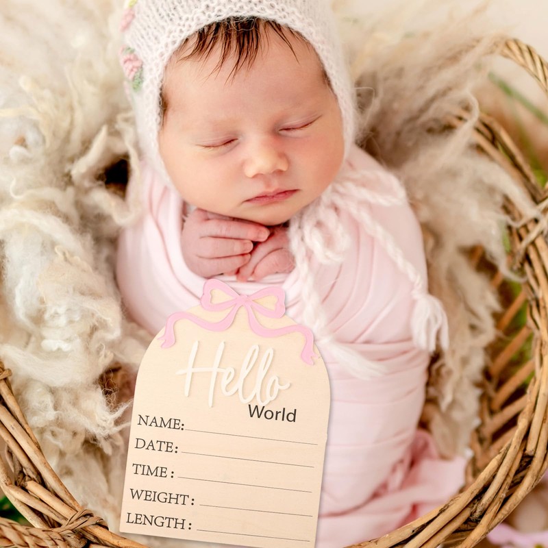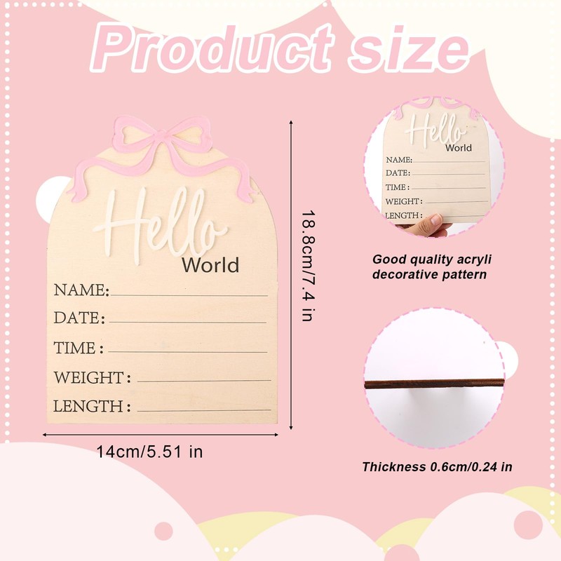 - Nettes Design: Dieses Holzschild ist mit "Hello World", Name, Geburtsdatum, Zeit, Größe, Gewicht und anderen vollständigen Geburtsinformationen eingraviert und ist auch mit einem rosa Bogen dekoriert, einfach und schön. Es ist ein perfektes Geburtsymbol und ein kostbares Souvenir.