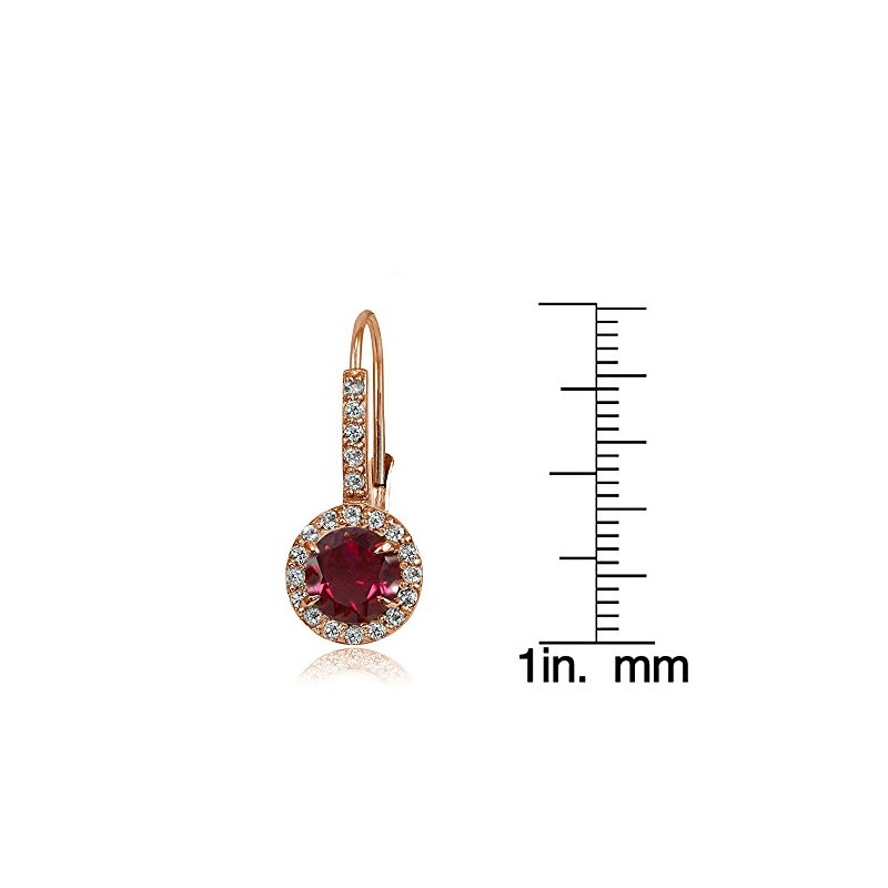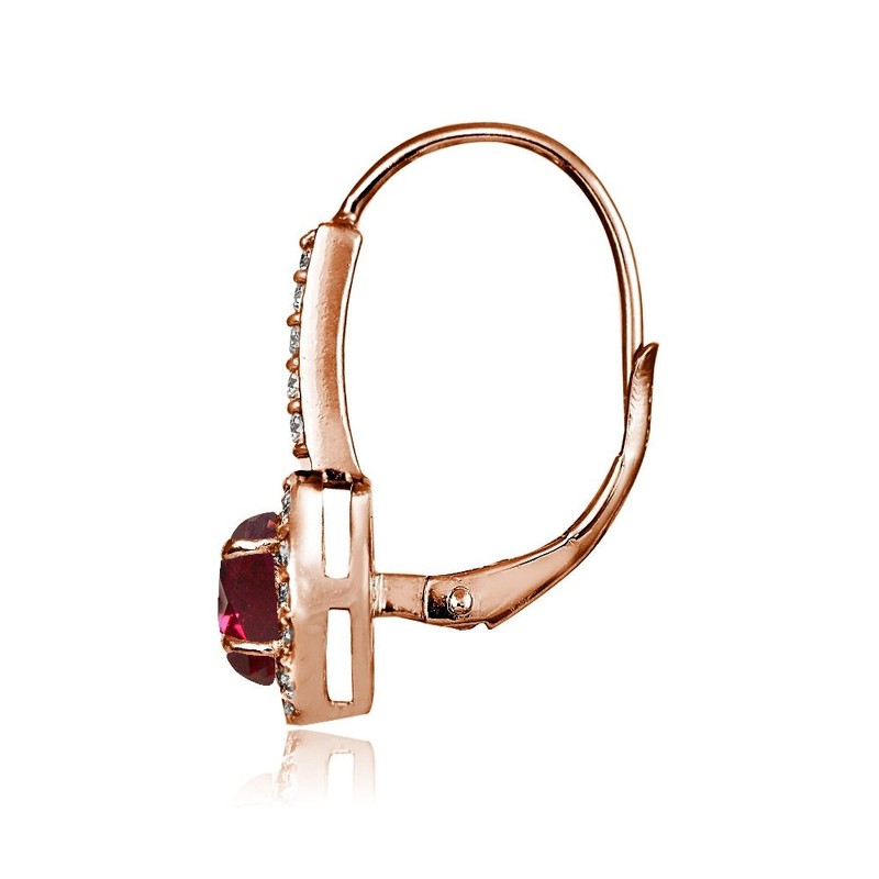 - These timesless, round, drop earrings feature 6mm round shaped created ruby gemstones surrounded by smaller CZ stones stones. Earrings are crafted of rose gold flashed 925 sterling silver.