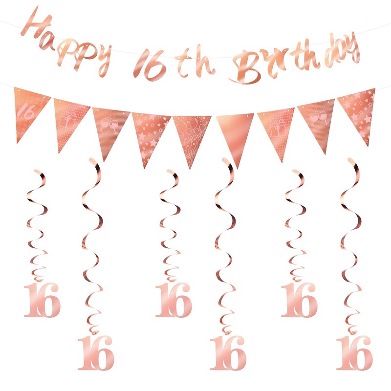 - STURDY AND ECO-FRIENDLY BIRTHDAY BANNERS:Crafted from sturdy eco-friendly cardstock, our 16 birthday decorations for girls include a "Happy 16th Birthday" set, 6 hanging swirls and a triangle banner set. Suitable for prominent display at your celebration