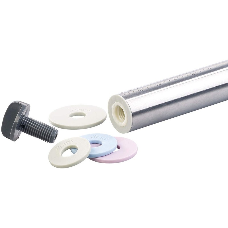 - Markings for measuring the dough width (10 - 34 cm) Rolling pin material: stainless steel, spacer discs: plastic