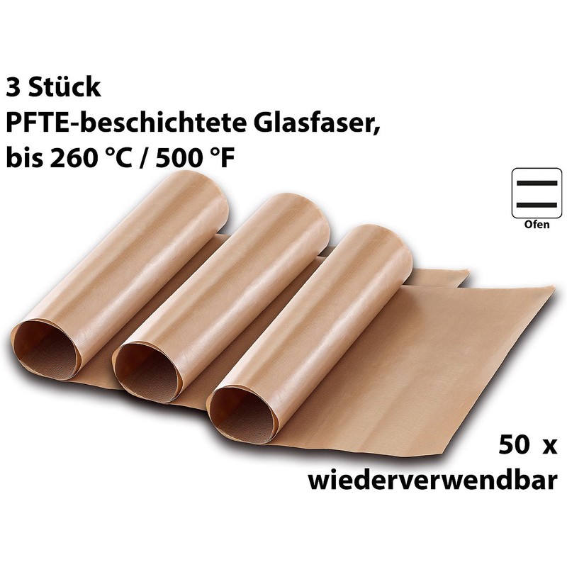 - Can be used like conventional disposable baking paper. Reusable up to 50 times. Material: PTFE coated fibreglass
