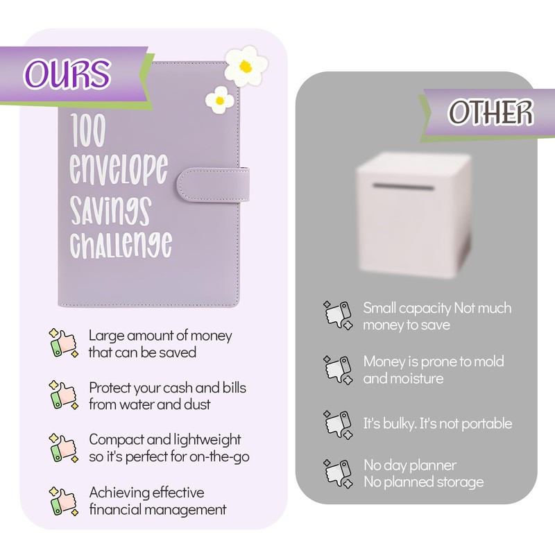 • 100 envelopes for goal achievement: the 100 envelope challenge folder uses a 100-day challenge method in which each envelope represents a day. The savings goal is achieved by recording in the flipbook. This book is ideal for solo savers or families looking to save together. The envelope folder can provide you with a helping hand on holiday, car, emergency fund and debt accounting