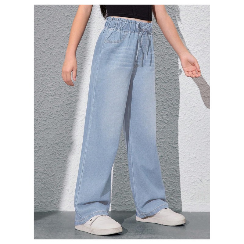 - Features: Drawstring, elastic high waist, straight leg, solid color, pocket, denim pants for girls