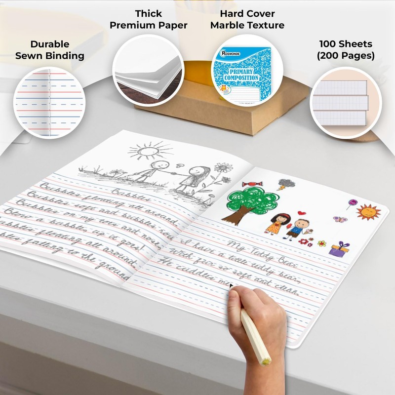 - PRIMARY COMPOSITION: Our 12 Pack primary composition notebooks come with 100 sheets (200 pages) of paper with sheet size of 9-3/4" x 7-1/2". The paper is thicker and of higher quality to handle pencils, crayons, and early handwriting efforts without ink bleed-through.