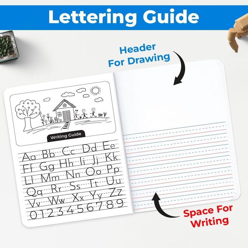 - KID-FRIENDLY, DOTTED MIDLINE: Each writing line features a dotted midline, which helps young writers learn to form lowercase and uppercase letters correctly. This structured format guides proper letter sizing and alignment, supporting handwriting development.