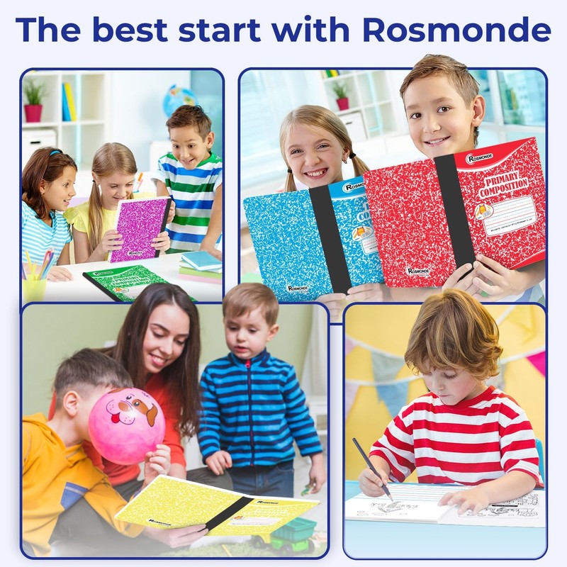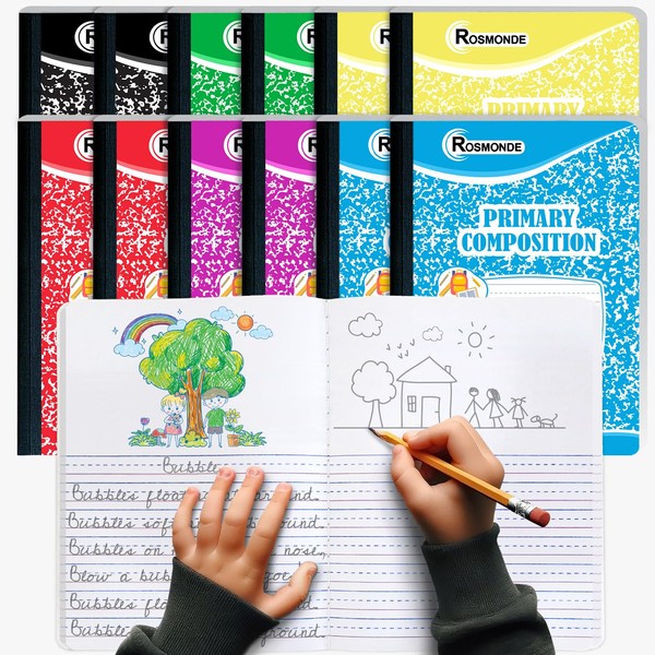 Rosmonde 12 Pack Primary Composition Notebook, 200 Pages (100 Sheets), Drawing and Writing Primary Journal For Kids, Grades K-2, With Header For Drawing, Sewn Binding Hard Cover, Assorted Marble