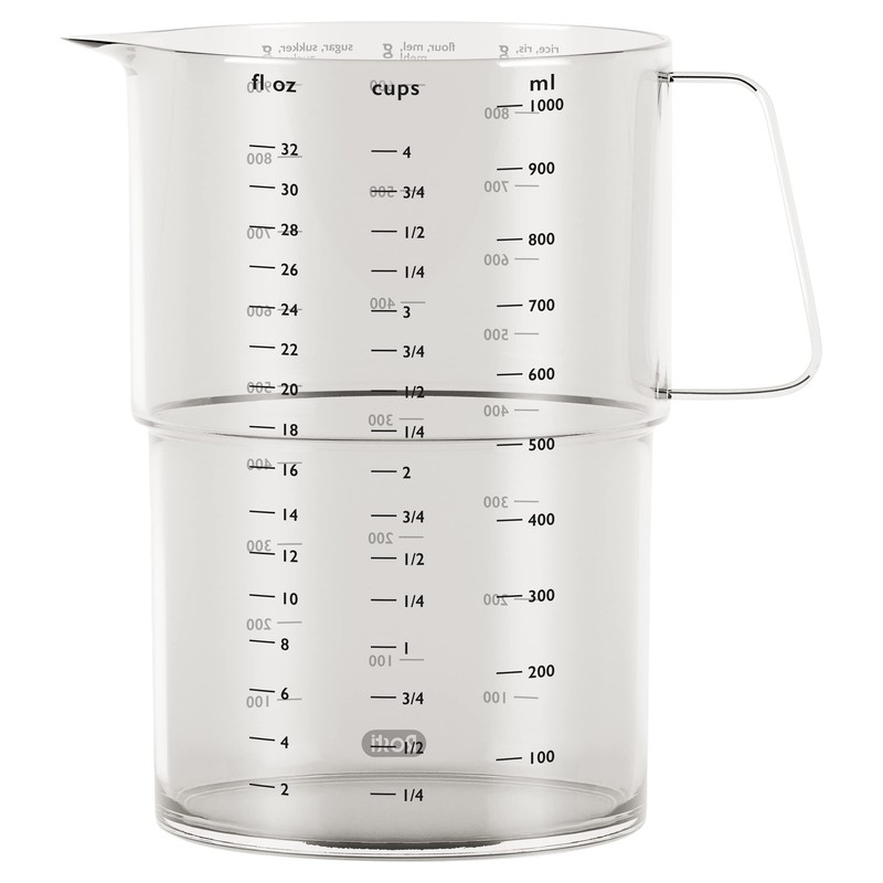 - In addition, the measuring cup has clear measurement indicators for ml, cups and fl oz as well as for flour, rice and sugar.