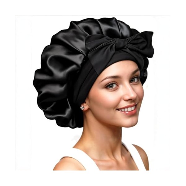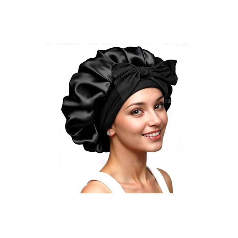 RosyReeds Satin Bonnet for Sleeping Women with Tie Band (Black)