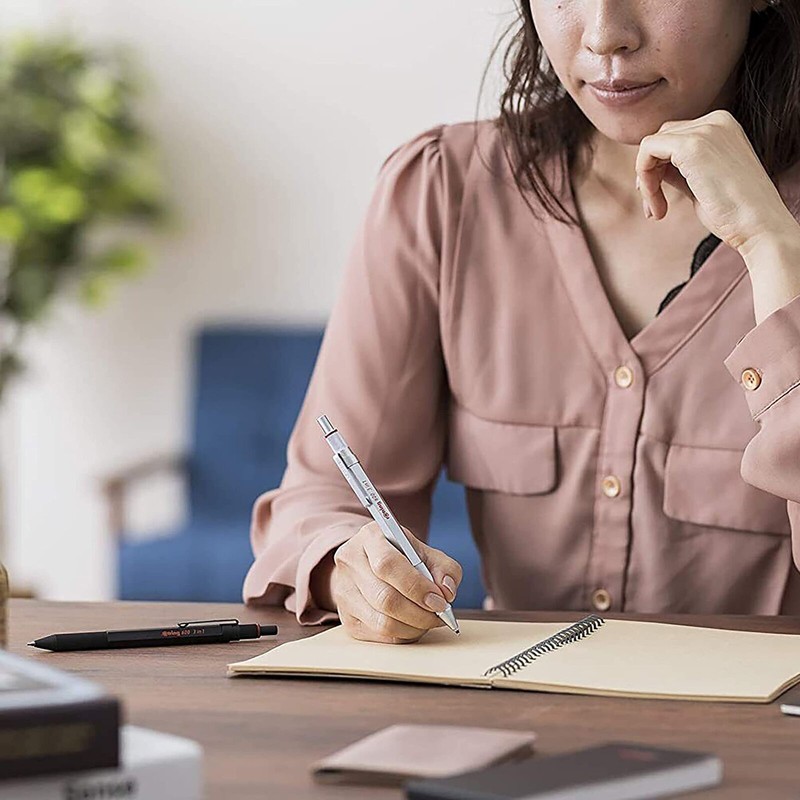 Quickly switch between pen and pencil with the rOtring 600 3-in-1 Multicolor Pen and Mechanical Pencil. This iconic writing instrument features 3 writing modes—2 ballpoint pen colors and 1 mechanical pencil lead—making it the ideal professional tool for technical writing, sketching, and drafting. The pen-pencil hybrid features a full metal body that provides ideal weight. The metal pen’s hexagonal shape avoids sliding on drawing tables and ensures fatigue-free writing and drawing. Plus, the metal knurled grip prevents the tool from slipping out of your hand. For the mechanical pencil, the fixed lead guidance sleeve prevents breakage and gives you a clear page view for precise ruler-based drawing. The adjustable lead harness grade indicator always lets you identify the pencil in hand. Finally, this luxury pen and pencil comes with a black barrel for a sophisticated and modern look, and contains black and red ballpoint refills and 0.5mm lead.
