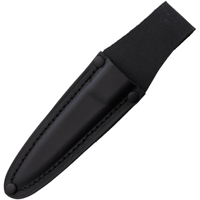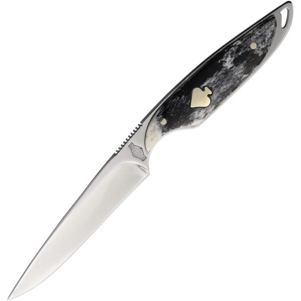 Appaloosa 6.5" (16.51cm) overall. 3.25" (8.26cm) mirror finish 440A stainless blade. Black and white smooth bone handle. Inlay shield. Full, extended tang. Lanyard hole. Black leather belt sheath. Boxed. Zebu - Bos taurus indicus bovine bone. -