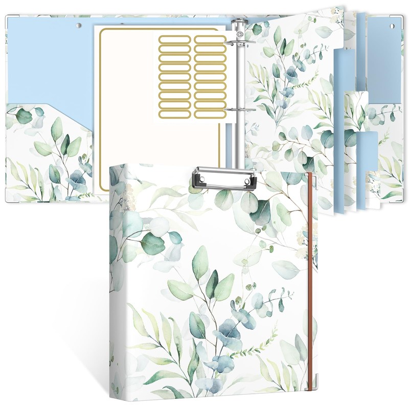 Rouidr 3 Ring Binder, 2 Inch Round Ring Binder Organizer with Clipboard, 5 Dividers Tabs, A4 8.5 x 11 Inch Paper & Clear Sleeves for School, Office Supplies, Eucalyptus Leaf