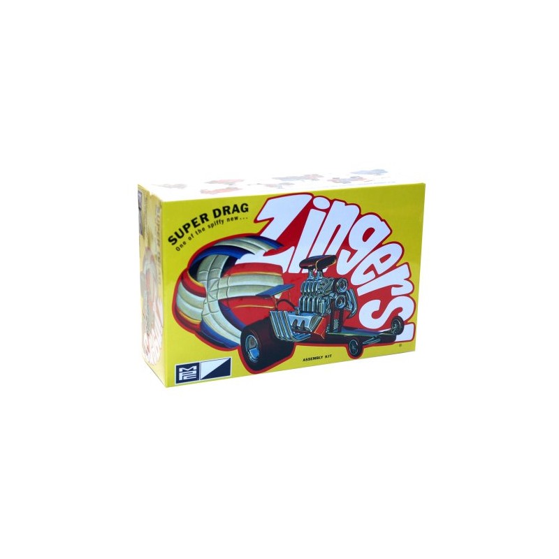 The Zingers were taken from an original concept developed in the early 1970s by Denny Johnson, a master model builder during those years. His idea of putting oversized engines and wheels in a smaller scale body was received very well at model contests and custom car shows. MPC's engineering team turned the idea into the Zingers series which grew to a total of eight great kits. The Super Drag Zinger is ready to launch down the quarter mile with its big double- blown motor and duallie drag slicks. It comes with an "open" parachute that can be displayed with the built model. It even includes a special bonus photo postcard of the real Super Drag Zinger built by Steve Tansy. Decals included.