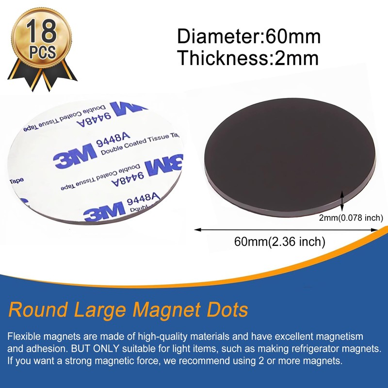 - 【Round Big Magnetic Dots with Adhesive Backing】18 Pcs Round Magnet Dots. 2.36” Diameter x 0.08” Thick (60mm x 2mm),One side is adhesive and the other side is sticky back magnets. Using adhesive magnet dots on non-metallic materials, allowing you to stick anything you want