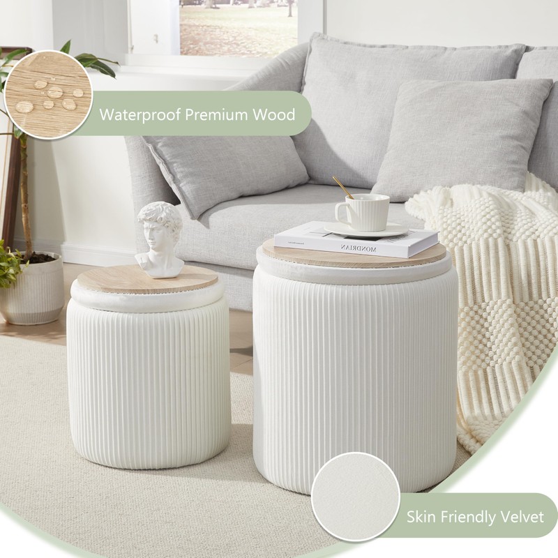 Round Ottoman with Storage Set of 2,Vanity Stool with Storage for Bedroom, Ottoman Coffee Table,Small Velvet Foot Stool for Living Room, White