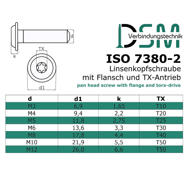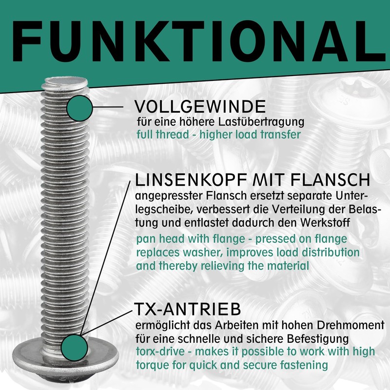 - Size: M6 x 70 mm, thread length: 70 mm, full thread, flange diameter 13.6 mm, TX-30