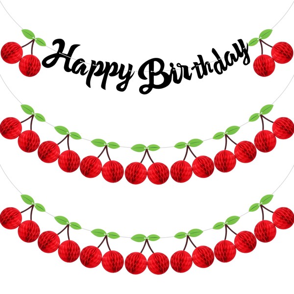 RoundFunny 3 Pack Happy Birthday Cherry Banner Party Decoration 8. 2 ft 3D Honeycomb Cherry Garland and Happy Birthday Banner Paper Honeycomb Summer Fruit Decor for Baby Shower Wedding Bridal Shower